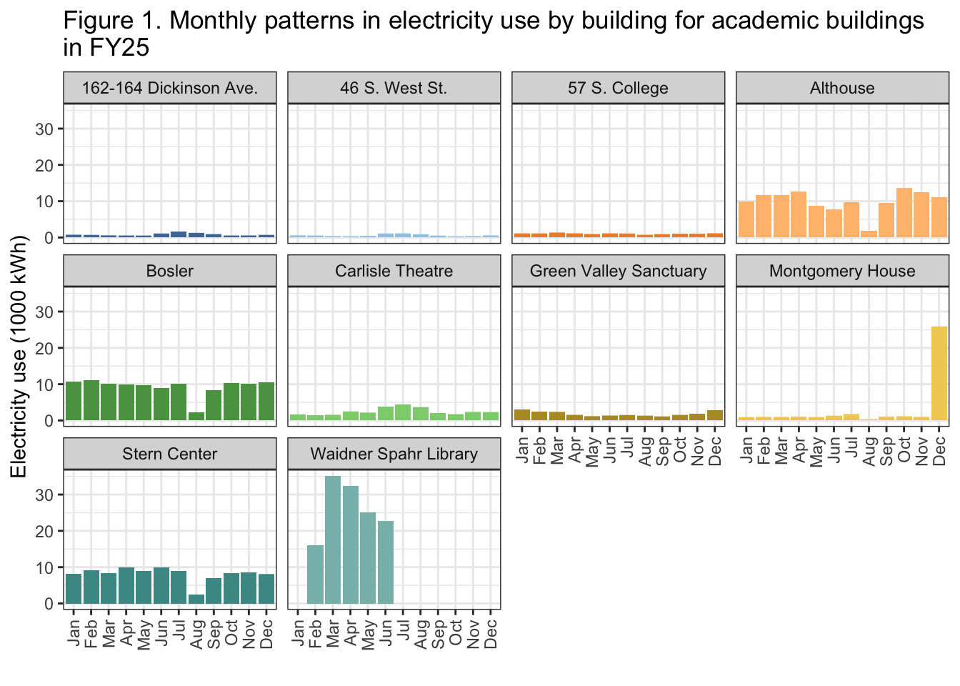 The largest electricity users among Dickinson’s academic buildings are Waidner-Spahr Library, Althouse, Bosler Hall, and the Stern Center, which consistently show the highest total monthly electricity consumption, particularly during the academic year (Figure 1). Buildings such as 46 S. West St., 162–164 Dickinson Ave. and 57 S. College St. are the smallest electricity users overall, with consistently low consumption across all months (Figure 1). There is substantial variability in electricity use both across buildings and across seasons. Larger, high-use buildings maintain relatively high consumption year-round but often show slight decreases during summer or winter breaks. Other buildings, such as Montgomery House, exhibit extreme variability, with a sharp spike in December that is inconsistent with the rest of the year (Figure 1).