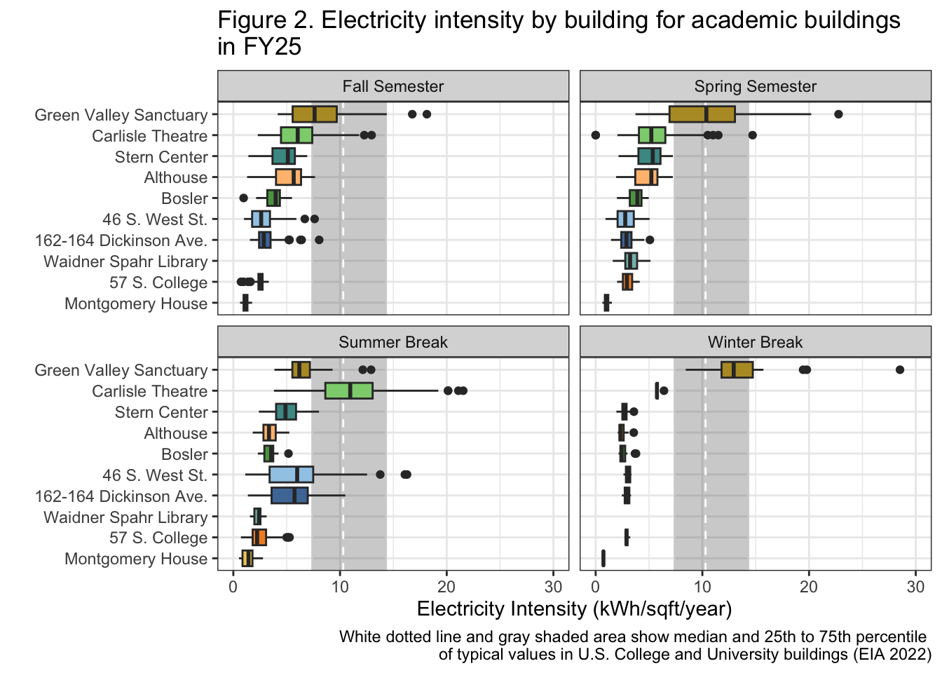 When compared to the U.S. Energy Information Administration’s 2018 Commercial Buildings Energy Consumption Survey, most of Dickinson’s academic buildings perform well, with electricity intensities below the national median during both academic semesters and break periods. However, exceptions such as Carlisle Theatre and Green Valley Sanctuary meet or exceed the EIA median (Figure 2), suggesting potential problems or different electricity demands that should be further examined. Dickinson’s academic buildings are functioning well and are showing a generally strong performance compared to the college and university section in the EIA building survey, variation between buildings suggests there are still opportunities to improve efficiency. Several buildings (Althouse, Bosler Hall, Stern Center, and Waidner-Spahr Library) consistently show higher electricity use than others, particularly during the fall, winter, and spring months (Figure 1). These buildings should be prioritized to see what could possibly be causing these electricity inefficiencies. Buildings with consistently low electricity intensity relative to other buildings may serve as useful models, and analyzing their operational practices could help inform electricity-saving strategies across campus.