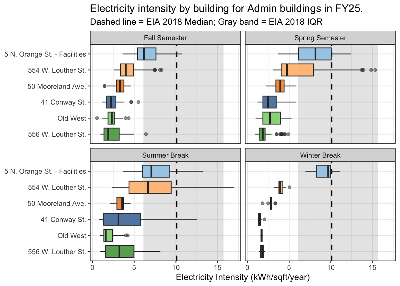 ###### Figure 2. Annualized daily electricity intensity by academic period and administrative building. This faceted boxplot shows how the daily electricity intensity (kWh/sqft/year) for administrative buildings changes throughout the year. The median usage of a building is used to rank it from highest to lowest. The horizontal dashed black line shows the national median (10.1 kWh/sqft/year), and the shaded gray band shows the interquartile range (6.1 to 15.7 kWh/sqft/year) from the EIA 2018 Commercial Buildings Energy Consumption Survey.