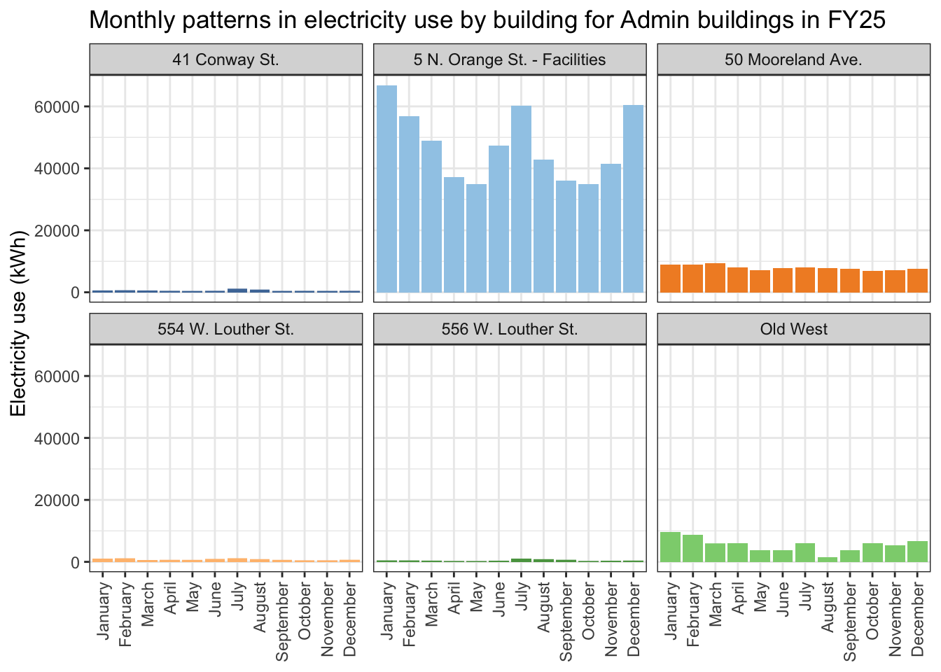 ###### Figure 1. Monthly changes in how much electricity administrative buildings used in FY25. This bar plot with facets shows how much electricity (in kWh) the college's administrative buildings used each month. Note: There is a known gap in data collection for all buildings connected to the Weiss Meter (including Old West) during part of August. This makes the reported total for that month seem lower than it really is.