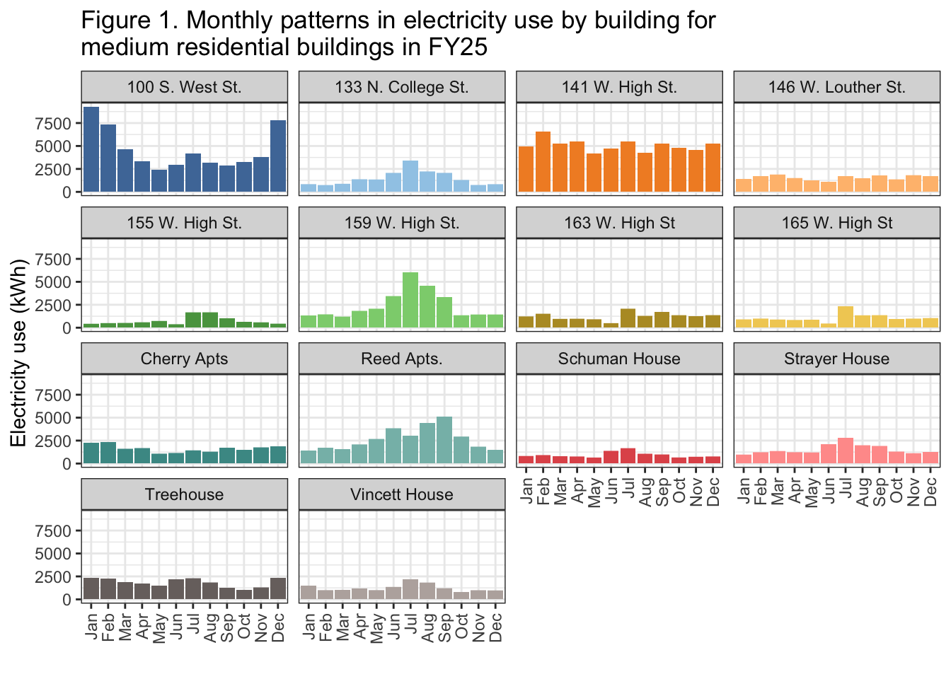 title = "Figure 1. Monthly patterns in electricity use by building for \nmedium residential buildings in FY25",