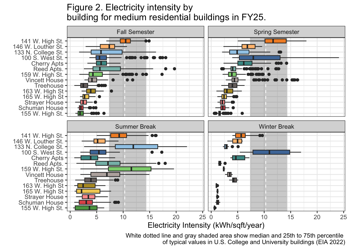 caption = "White dotted line and gray shaded area show median and 25th to 75th percentile \nof typical values in U.S. College and University buildings (EIA 2022)")