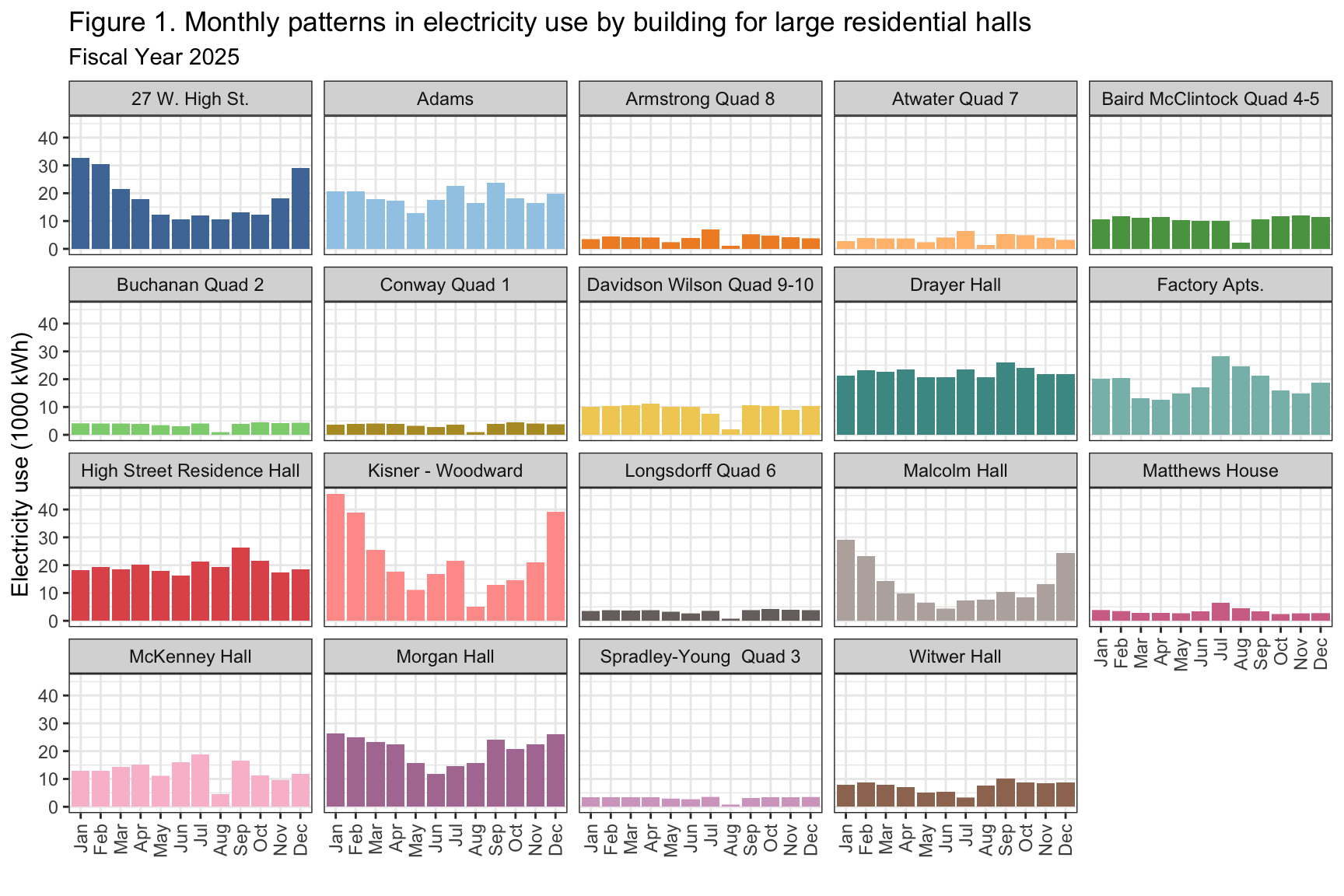 Figure 1 shows the monthly patterns in electricity use during fiscal year 2025. Some buildings, such as Kisner-Woodward and 27 W. High Street, have a distinct u-shape, indicating higher use during winter months, and lower use during the summer months. The buildings with this shape also tend to have the highest electricity usage. However, the majority of buildings have a flat shape, showing that electricity use did not differ much during any point of the year. It is also notable that more than half of the buildings have a dip during either July or August where there is very little electricity use.