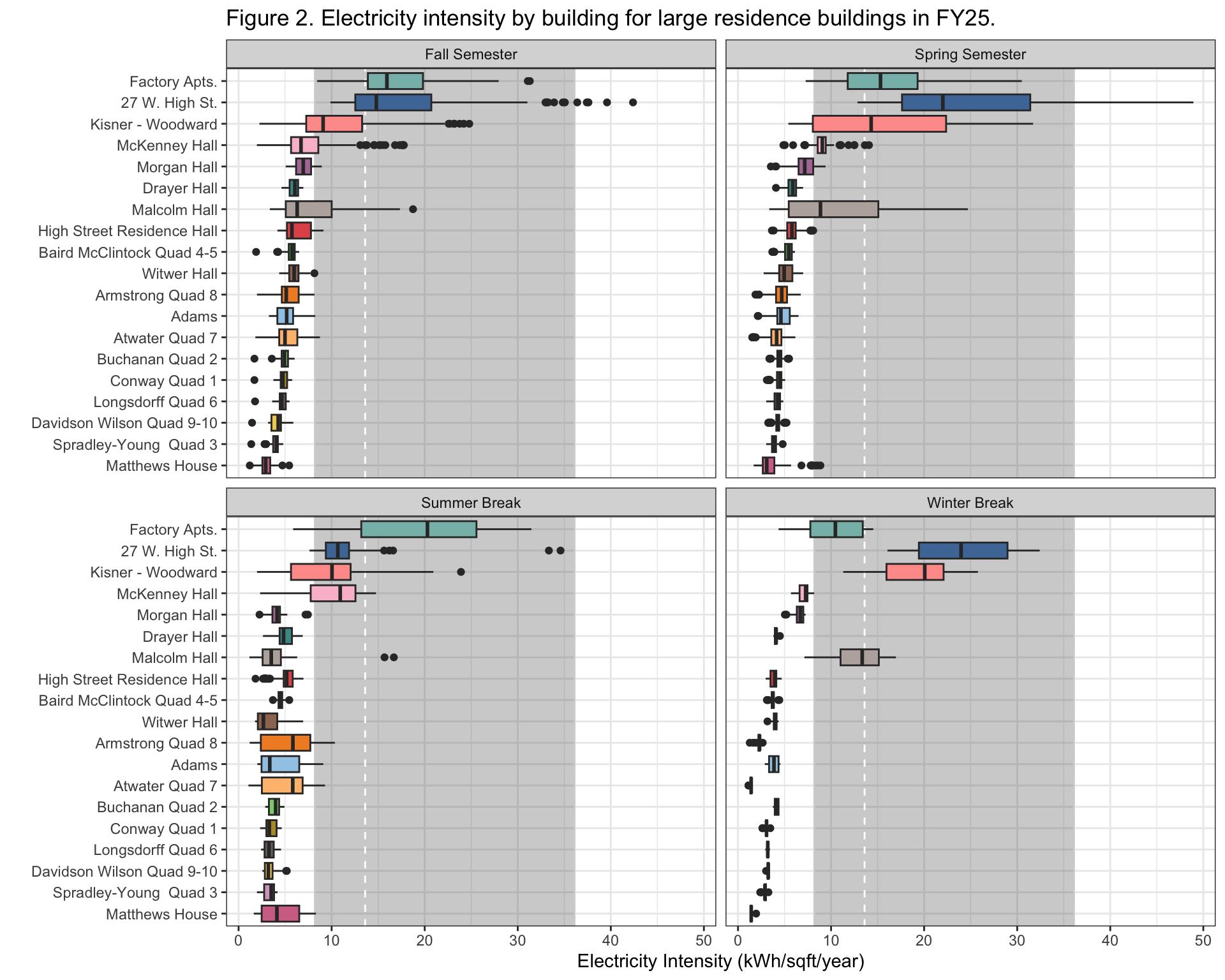 Figure 2 shows the electricity intensity by building for fiscal year 2025, and is faceted into different sections by seasons: Fall, Spring, Summer, and Winter. Winter break has the lowest variability in electricity intensity, demonstrated by the boxplots with very small ranges. Spring semester has the highest overall electricity intensity, followed closely by fall semester. Factory Apartments, 27 W. High Street, and Kisner-Woodward consistently have the highest electricity intensity across seasons. Malcolm Hall also has notably high electricity intensity in the fall, spring, and winter. Additionally, buildings that appear to usually have low variability in electricity intensity have increased variability over summer break. This can be seen in Armstrong, Adams, Atwater, and Matthews House.
