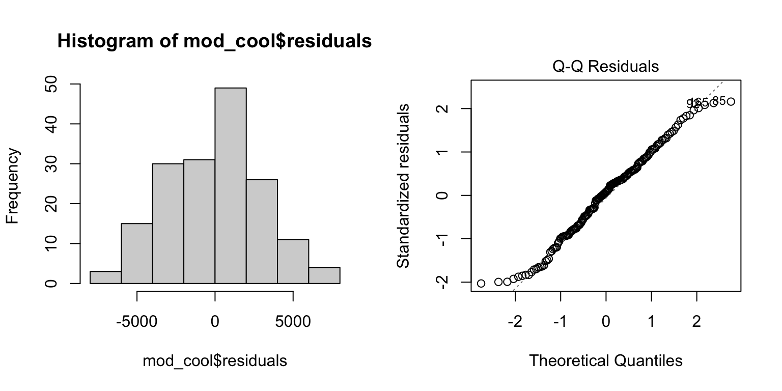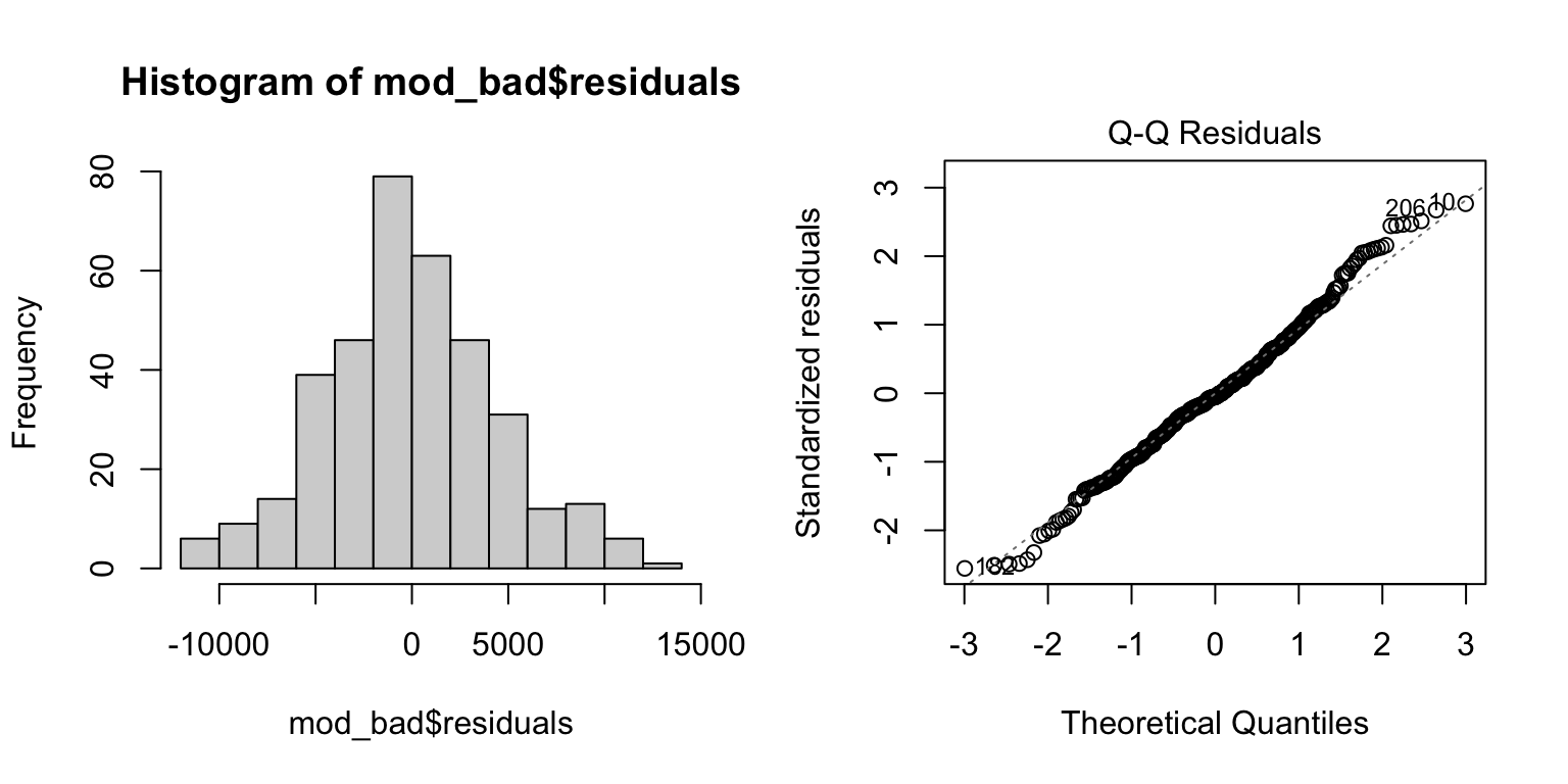 • The histogram of the residuals looks slightly left-skewed now. It is still probably not a huge problem, given that linear regression is not too sensitive to this assumption. Still, this is a clue that perhaps there is some variable that is not captured in our current model.
