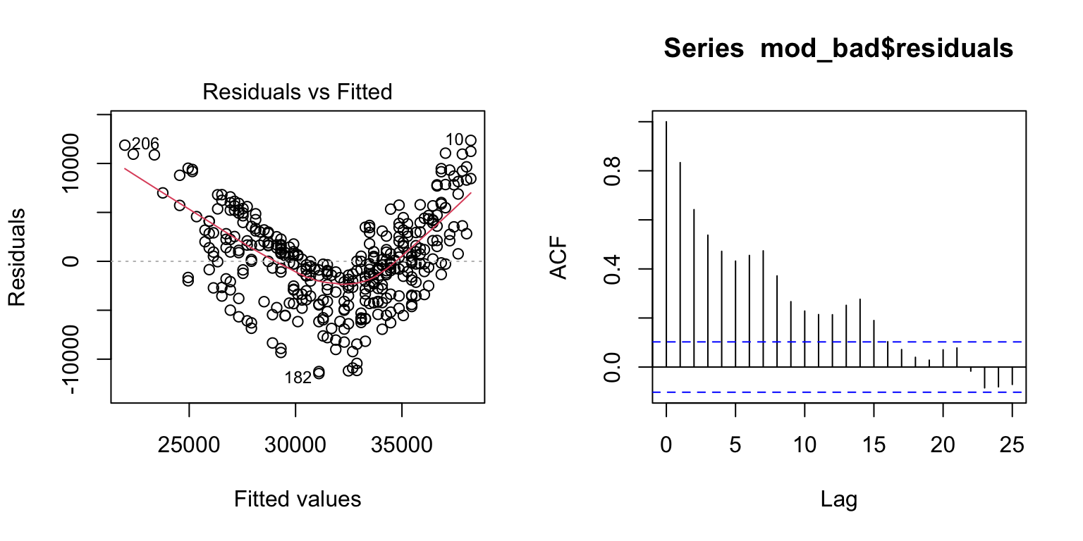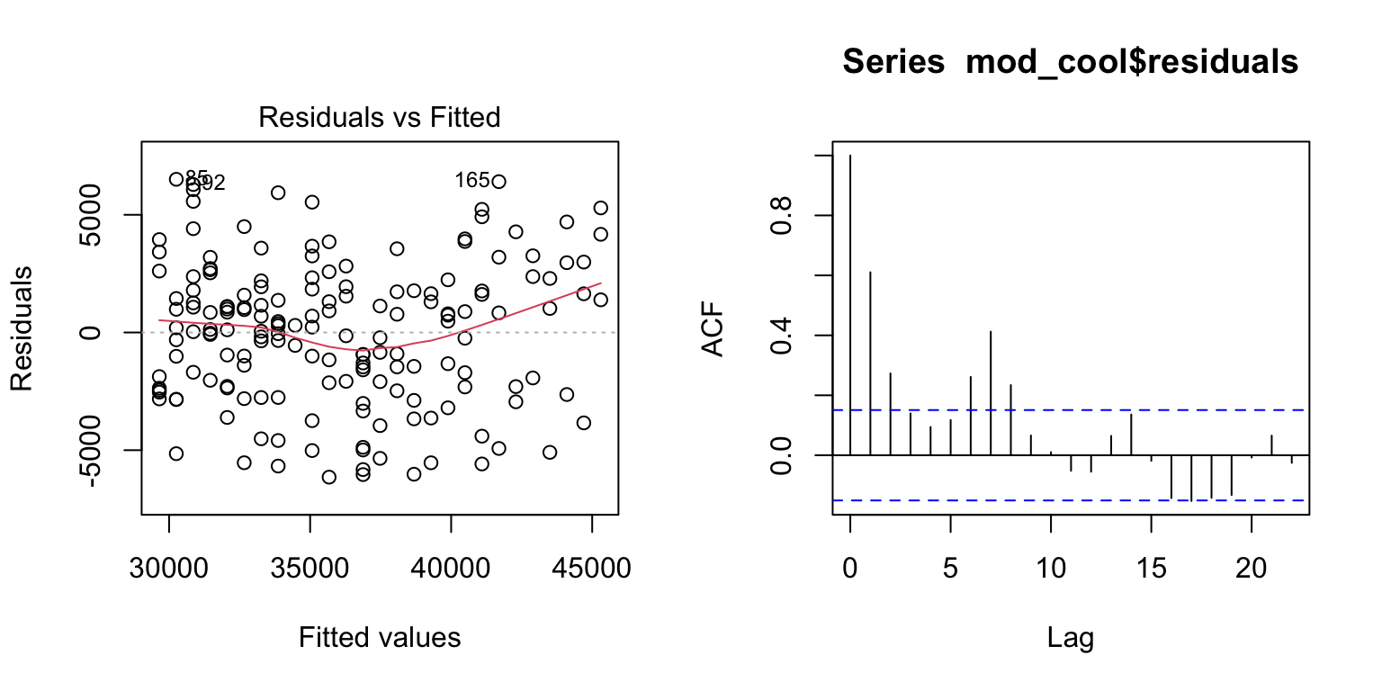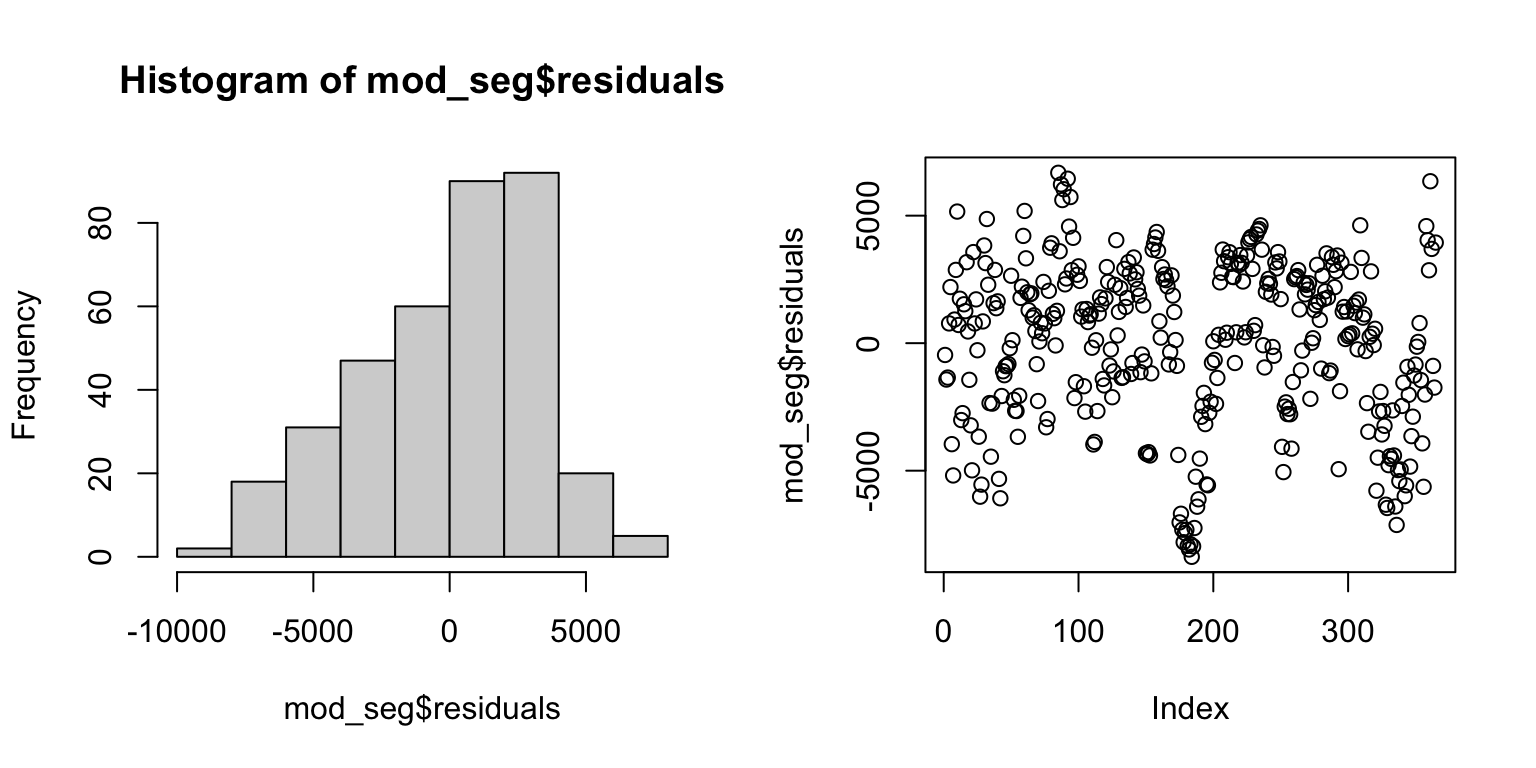 • Fitted model objects returned by the segmented() function work a bit differently than model objects created by lm(), so we will slightly adjust our approach to checking assumptions and drop the Q-Q plot.