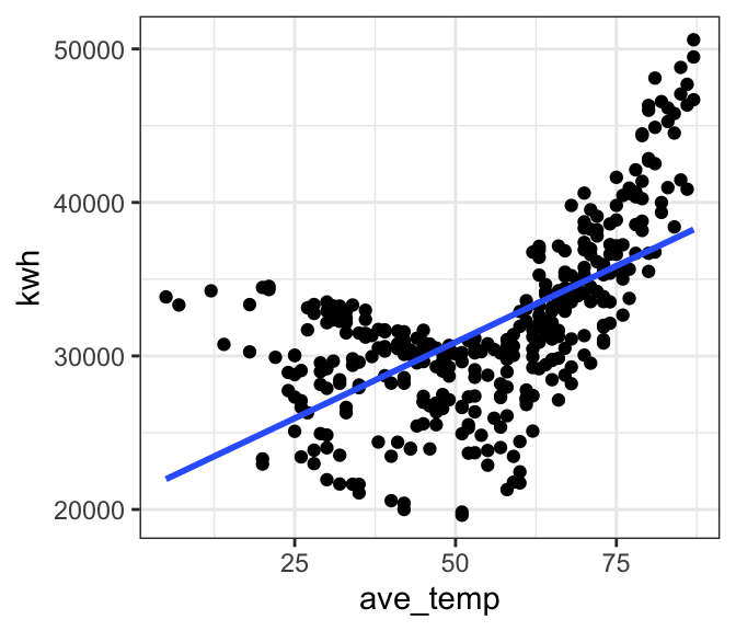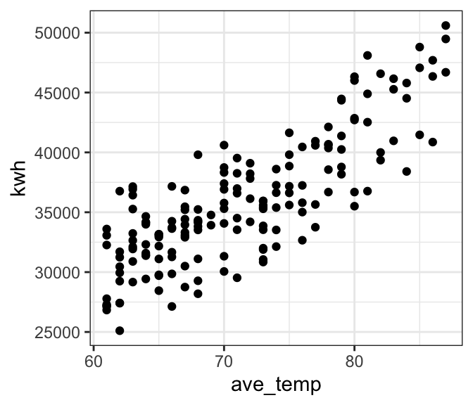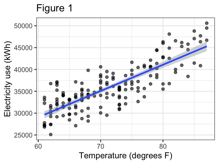 xlab = "Temperature (deg F)", ylab = "Electricity use (kWh)") # label axes